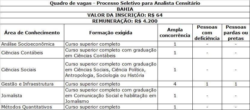 As vagas são para o cargo de Analista Censitário e exigem nível superior completo em diversas áreas de conhecimento, como Ciências Contábeis, Ciências Sociais e Jornalismo