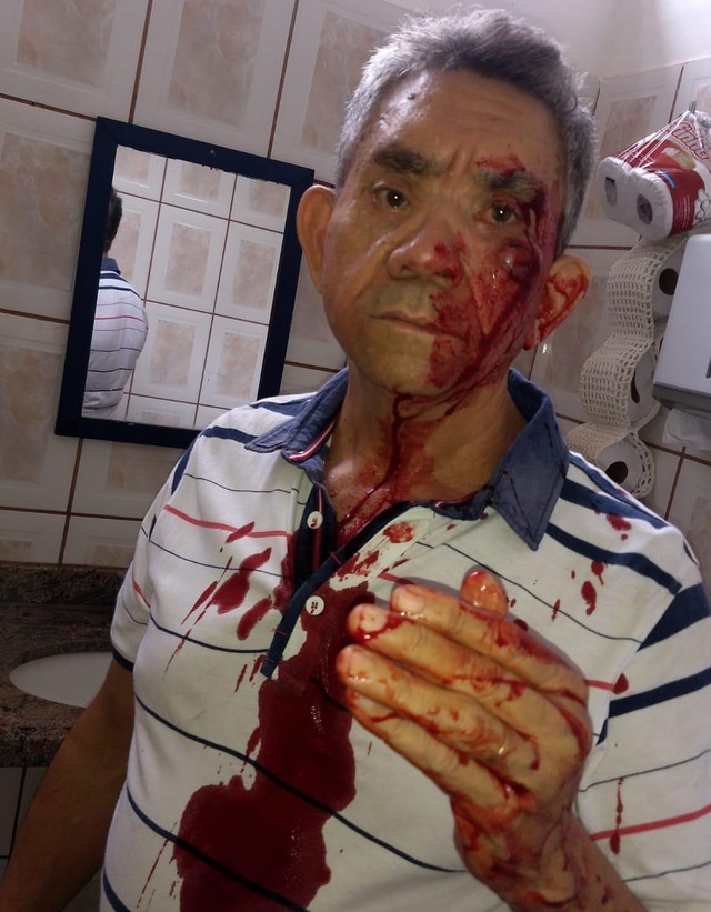 O professor Paulo Rafael Procópio, de 62 anos, ensanguentado no banheiro da escola após a agressão: "Decepção" — Foto: Arquivo pessoal.