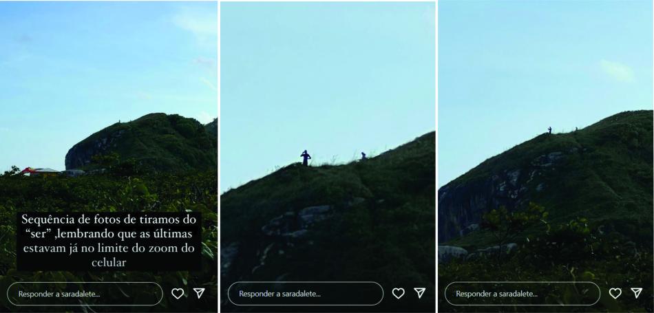 A gente deu um zoom, iPhone 13 Pro, que é o meu. Inclusive tô com a as imagens salvas, e não foi nesse sábado que a gente fez a filmagem, vou botar a data certinha. Aí a gente deu zoom pra identificar, pra ver se realmente era uma pessoa, aí ficou assim, borrada. Mas a gente achou o comportamento da pessoa muito estranho, que tava no morro...achou que ela desceu também muito rápido, sei lá, pode ser realmente uma pessoa, que ela tenha o costume de descer morro, e tudo. Quem já foi na Ilha do Mel sabe que lá é muito íngreme, e que é muito chato de subir. E é isso, a gente fez a filmagem, e meu marido pediu as filmagens, passei pra ele, que passou pra algumas pessoas que viu também, e provavelmente essa pessoa divulgou, e viralizou, e ficou essa loucura.