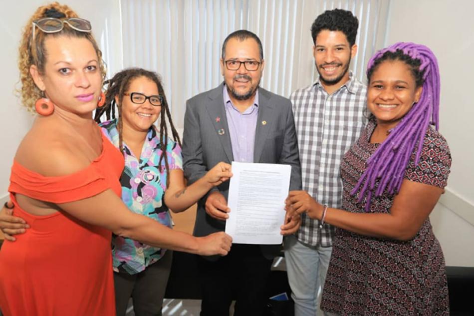 Presidente da ABGLT, e militantes entregam ao deputado Jacó a minuta de lei que deu origem ao projeto baiano. Foto: Symmy Larrat.