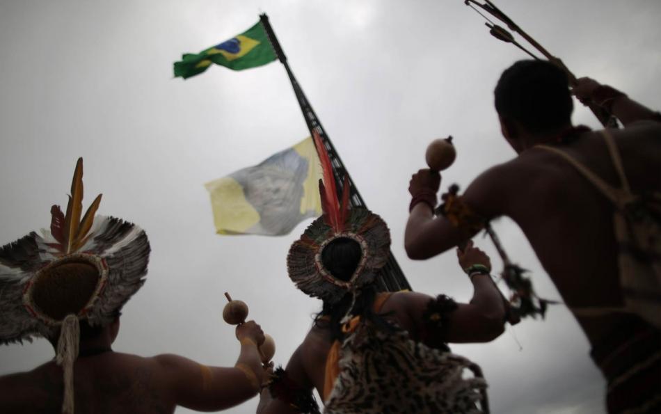 Índios de diferentes partes do Brasil observam uma bandeira com a imagem de um indígena ser erguida no mastro da Bandeira Nacional em Brasília, durante protesto em parceria com o Greenpeace contra a PEC que antera a lei de demarcação de terras. — Foto: Ueslei Marcelino/Reuters.
