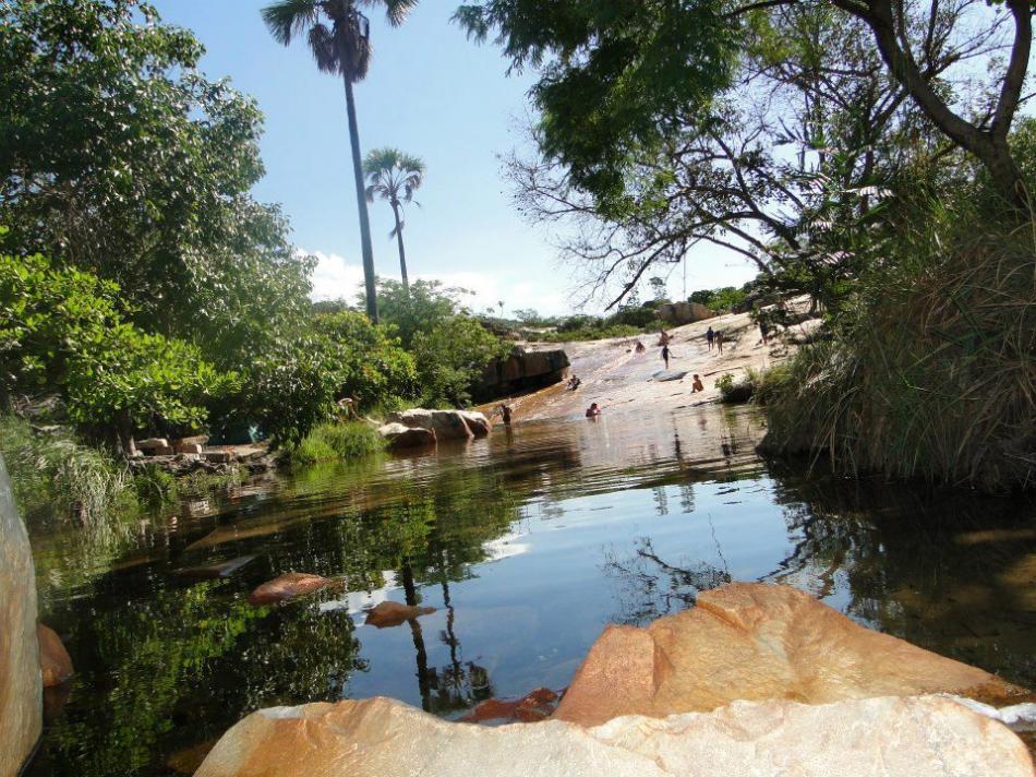 ESCORREGA: É um lajedo inclinado banhado por um riacho, onde os visitantes escorregam do alto até o poço de água cristalina.