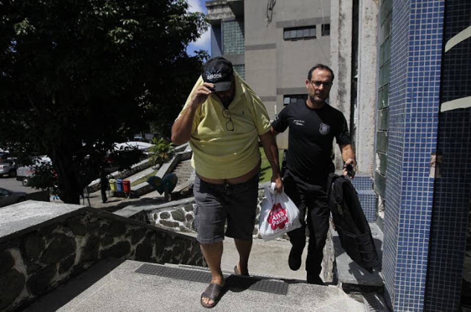 Minutos antes dos detalhes da operação serem revelados à imprensa, os policiais federais chegaram com o empresário Roberto Pereira de Oliveira. Ele estava com as mãos algemadas para trás e o rosto coberto com a camisa amarela que usava.