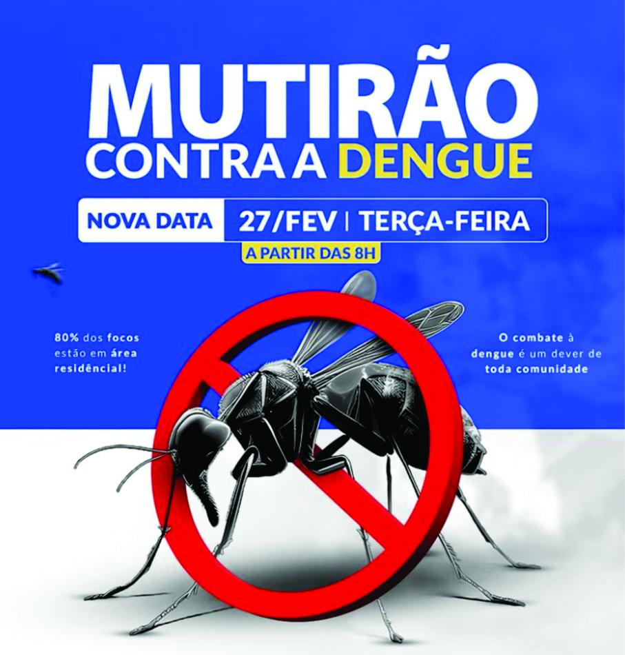 A Secretaria Municipal de Saúde, em colaboração com a Prefeitura Municipal de Gentio do Ouro, informa à comunidade sobre o Mutirão de Combate à Dengue agendado para a próxima TERÇA-FEIRA, dia 27 de fevereiro.