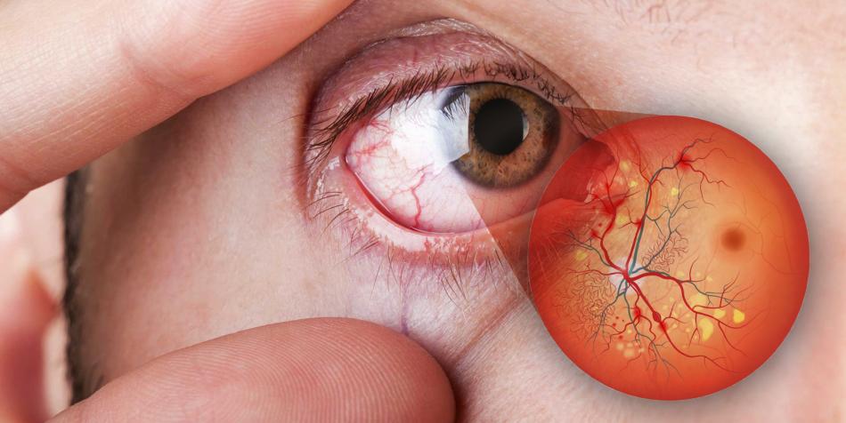 Afetando a retina, pode comprometer a visão em 80% dos casos após 20 anos de doença. Com o agravamento do quadro, há o desenvolvimento desde hemorragias até descolamento de retina e cegueira.