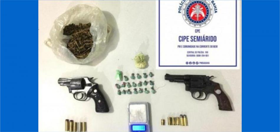 Drogas, duas armas de fogo e uma balança de precisão foram apreendidas e levadas à delegacia.