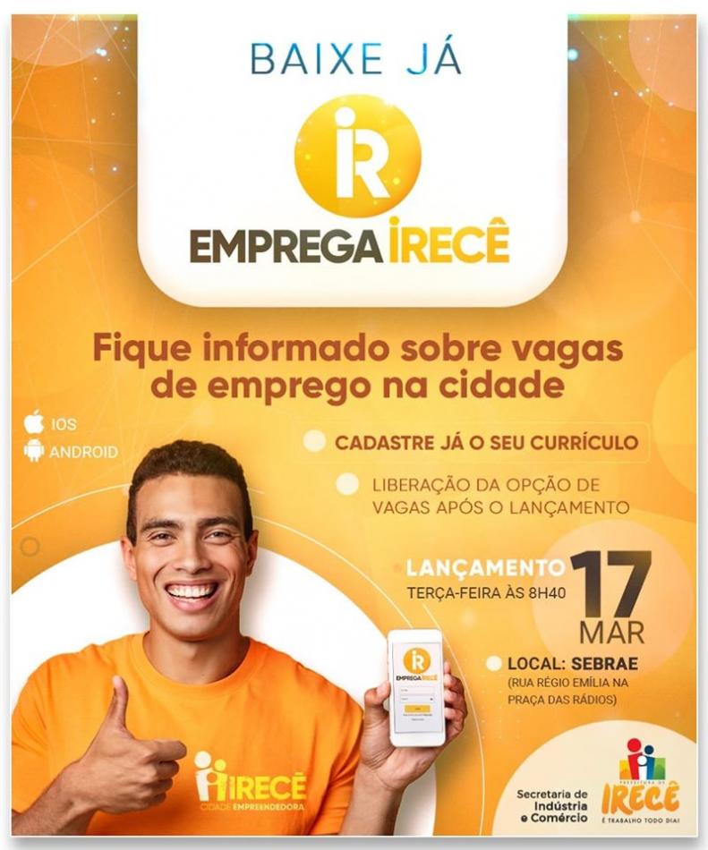 A Prefeitura de Irecê, por meio da Secretaria de Indústria e Comércio, criou o aplicativo EMPREGA IRECÊ, já disponível para Android e IOS. Baixe já, cadastre o seu currículo e fique de olho nas vagas que serão disponibilizadas após o lançamento.