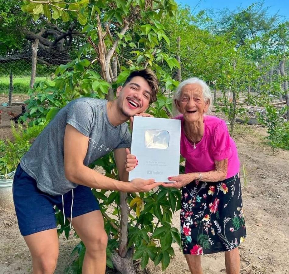 Rafael Barbosa Nunes, de 22 anos, conhecido popularmente por RB Real, e sua avó, dona Francelina Pereira Novaes, 95 anos, conhecida por Vó Senhora, alegram o dia de milhares de seguidores mostrando suas rotinas e resenhas em casa, no povoado de Riacho do Cedro, distrito de Gentio do Ouro, na Bahia.