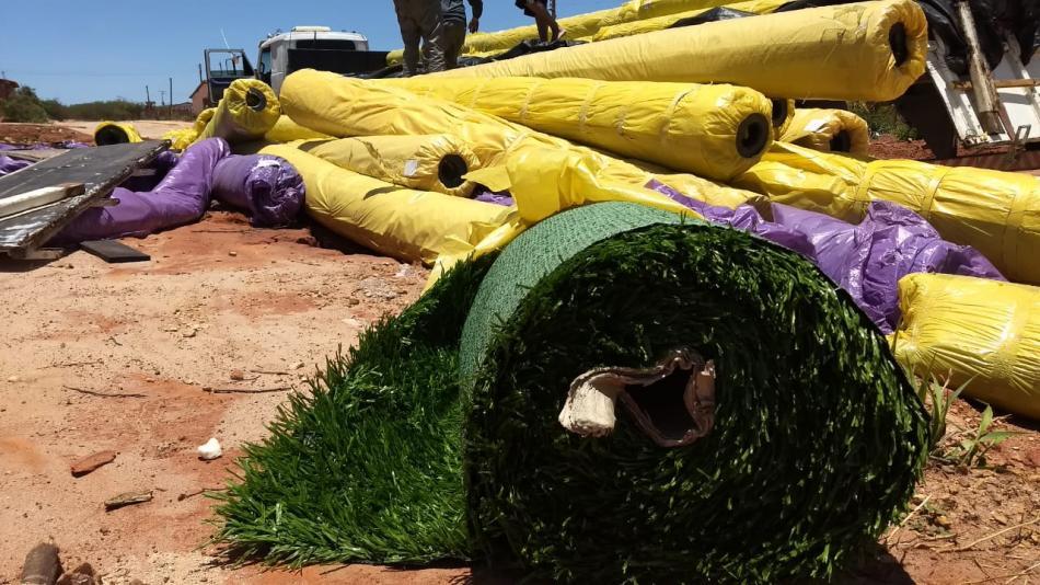 Ainda na manhã dessa sexta-feira (30), funcionários da empresa responsável pela execução das obras, receberam um caminhão com rolos do tapete sintético.