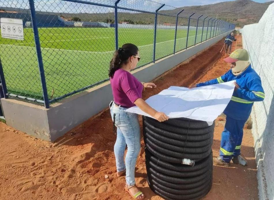 Sob a supervisão da secretária de Obras, Urbanismo, Serviços Públicos e Defesa Civil, Bartira Gomes, os operários iniciaram os trabalhos de escavação das canaletas ao redor do gramado para a instalação dos tubos por onde correrá a fiação.