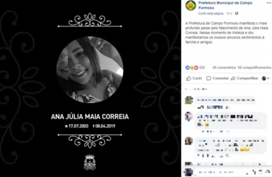 Nas redes sociais, a prefeitura municipal lamentou a morte da adolescente. — Foto: Reprodução / Redes Sociais.