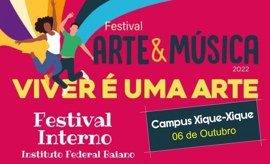 Audiodescrição: Card no formato quadrado de fundo colorido. No topo, à esquerda, ilustração de uma mulher e um homem lado a lado que realizam movimento que remete à dança. Ao centro, escrito em letras nas cores preta e amarela está o título: Festival Arte e Música 2022 Viver é uma arte. Em seguida o texto: Festival Interno Instituto Federal Baiano Campus Xique-Xique 06 de outubro de 2022 às 18 horas Concha Acústica da Praça Dom Máximo. Venha prestigiar nossos (as) artistas e viver um dia de muita arte e emoção. No rodapé, à direita, símbolo do instagram e ao lado o texto: famifbaiano. Abaixo logomarca da Proex e ao lado direito, logomarca do IF Baiano. Fim da audiodescrição.⠀⠀