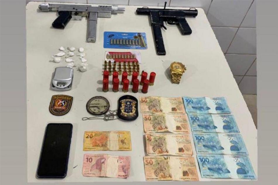 Em um imóvel usado pelo traficante, as forças de segurança apreenderam uma submetralhadora calibre 9mm, carregador, munições, oito pinos de cocaína, balança, relógio e 630 reais.