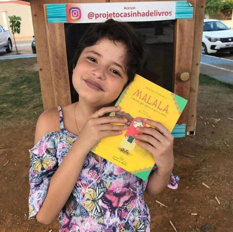Clara Beatriz segura o livro que inspirou a criação do projeto das casinhas de livros | Reprodução: Instagram.