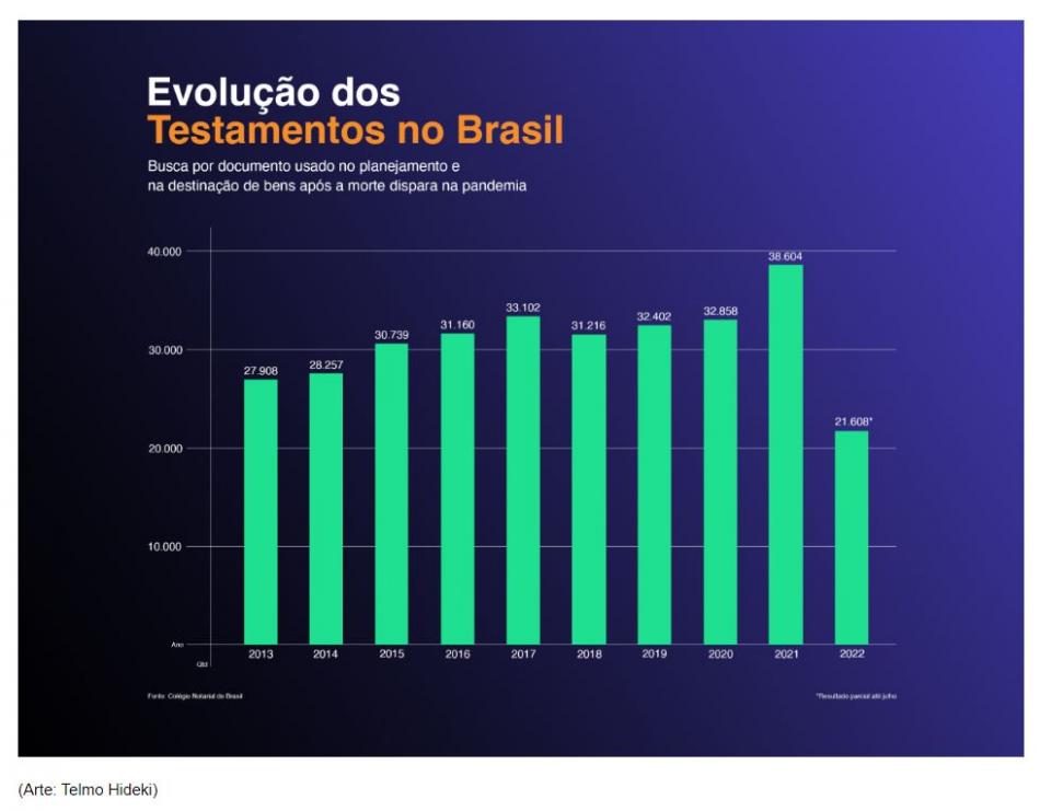 A informação constatada pelo Colégio Notarial do Brasil demostra aumento de 21,38% no número de testamentos lavrados entre janeiro e julho de 2022, em comparação com o mesmo período de 2019 (ano pré-pandemia).
