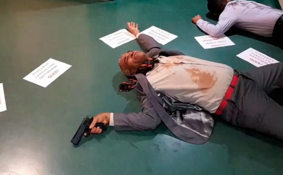 O deputado Pastor Sargento Isidório (Avante-BA) fez um ato na Câmara dos Deputados, em Brasília, em protesto contra o novo decreto do governo que libera armamento para algumas classes profissionais. Ele deitou no chão com a roupa manchada, simulando sangue, e uma arma na mão, que apontou para colegas e visitantes que passavam na Ala das Comissões, segundo a Coluna Esplanada.