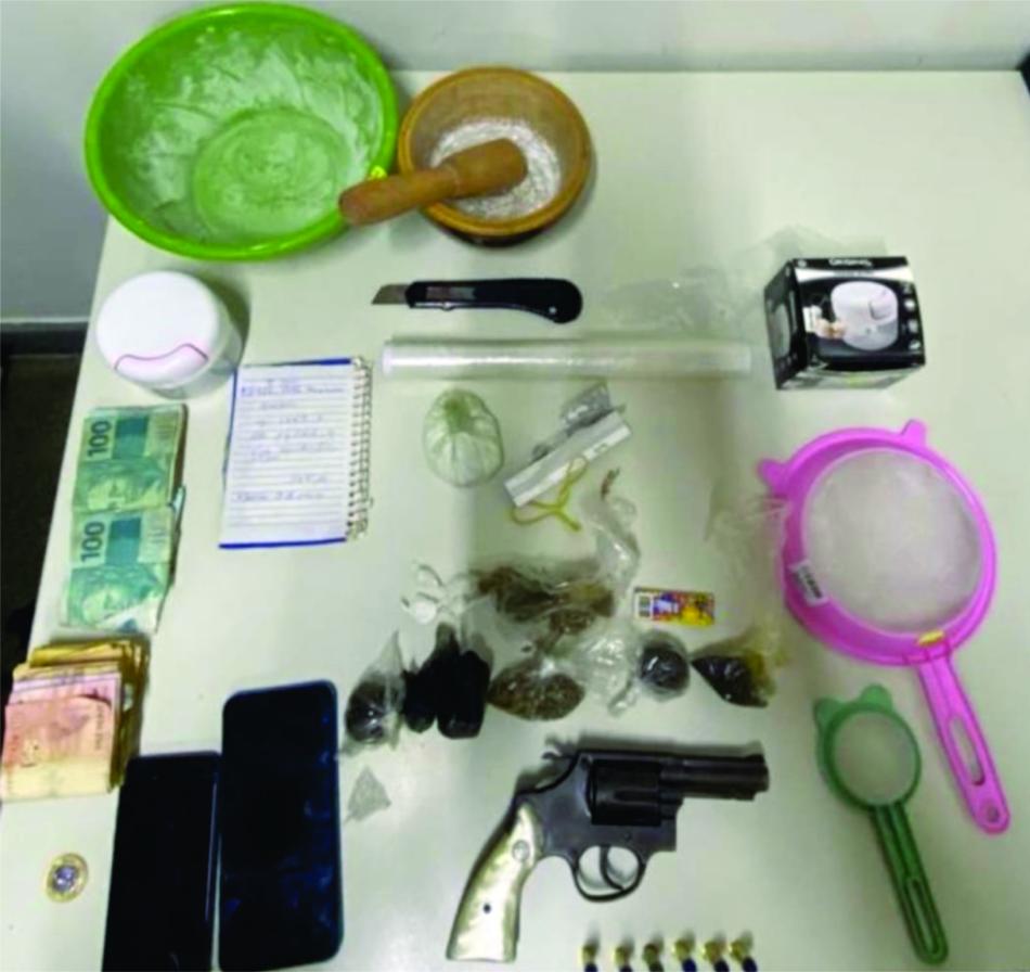 Após questionamentos, o suspeito indicou o local onde havia mais entorpecentes escondidos. Um segundo indivíduo foi localizado no referido local, portando uma quantidade de erva de cor verde, consistente em folhas e talos, similar à maconha. Persistindo as buscas, foram encontradas mais drogas (maconha e haxixe), um revólver calibre 38 (nº 784309), com 6 munições intactas, além de uma quantia em dinheiro de R$ 3.609,00.