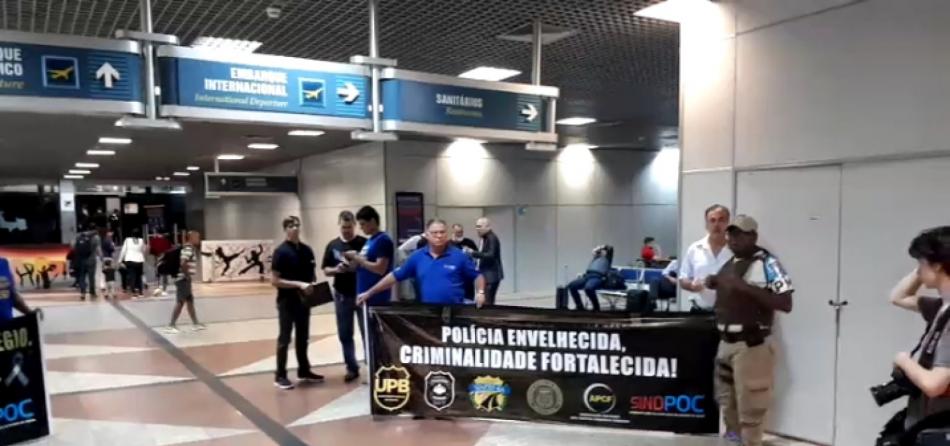 Policiais civis, policiais federais, policiais rodoviários federais e guardas municipais protestaram contra a Reforma da Previdência e em defesa da manutenção da Aposentadoria Especial, no Aeroporto Internacional Luís Eduardo Magalhães, em Salvador, na manhã de hoje (9).