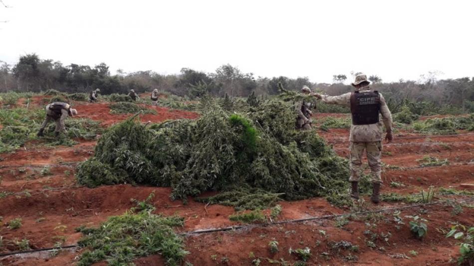 Devido a grande quantidade de pés (cerca de 250 mil), a polícia solicitou um trator da Prefeitura para ajudar na erradicação. No local, dentro de uma casa, os militares apreenderam ainda 72 kg da erva colhidos, 40 kg também da mesma droga prensada, vasilhas e sacolas plásticas.