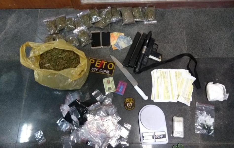 Depois do flagrante ele contou que guardava mais entorpecentes na sua residência. Na casa, os PMs encontraram uma submetralhadora calibre 9mm (uso restrito), carregador, munições, sacos com maconha, porções de cocaína, balança, faca e tesoura.