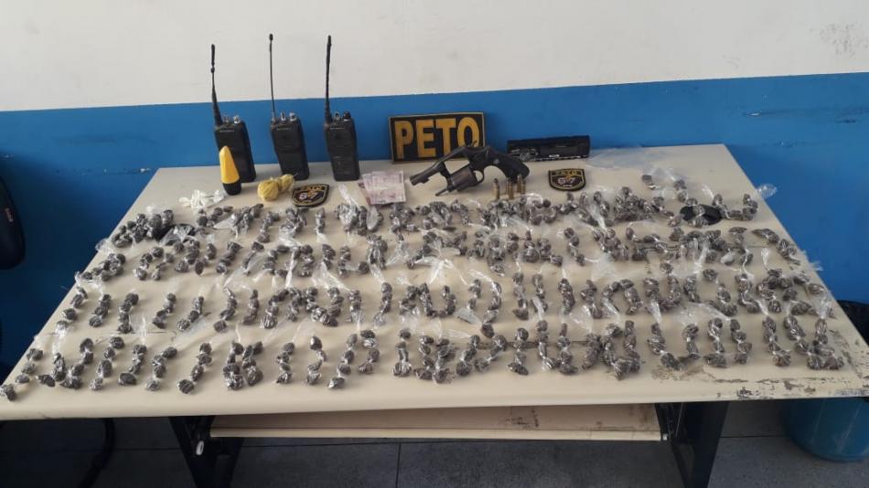 De acordo com o comandante da 67ª CIPM, major PM André Cavalcante, com o traficante foram apreendidos 551 buchas de maconha prontas para o comércio, uma pedra de crack, três rádios comunicadores, um revólver calibre 38 com munições, um aparelho sonoro e R$ 15. “Ele foi preso em flagrante por tráfico de drogas e porte ilegal de arma”, reforçou o oficial.