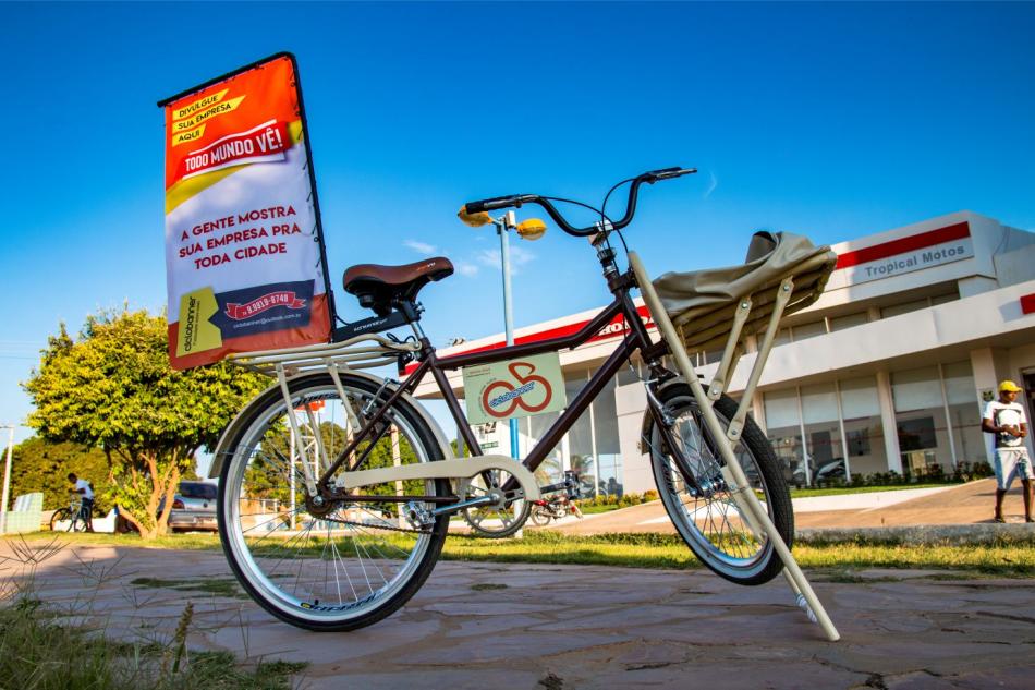 De estilo arrojado, a ‘bicicleta retrô’ carrega um banner com a marca da empresa, e logo atrai olhares por onde passa. O novo modelo de publicidade impacta de modo positivo, possibilitando maior visibilidade aos clientes.