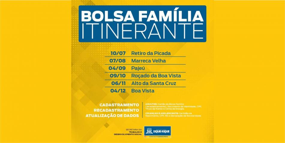 O Bolsa Família Itinerante estará, na próxima quarta-feira (4), atendendo os moradores de Boa Vista e região com serviços de cadastramento, recadastramento e atualização de dados, além de visitas domiciliares com assistentes sociais, entrega de Id Jovem e carteirinha do idoso.